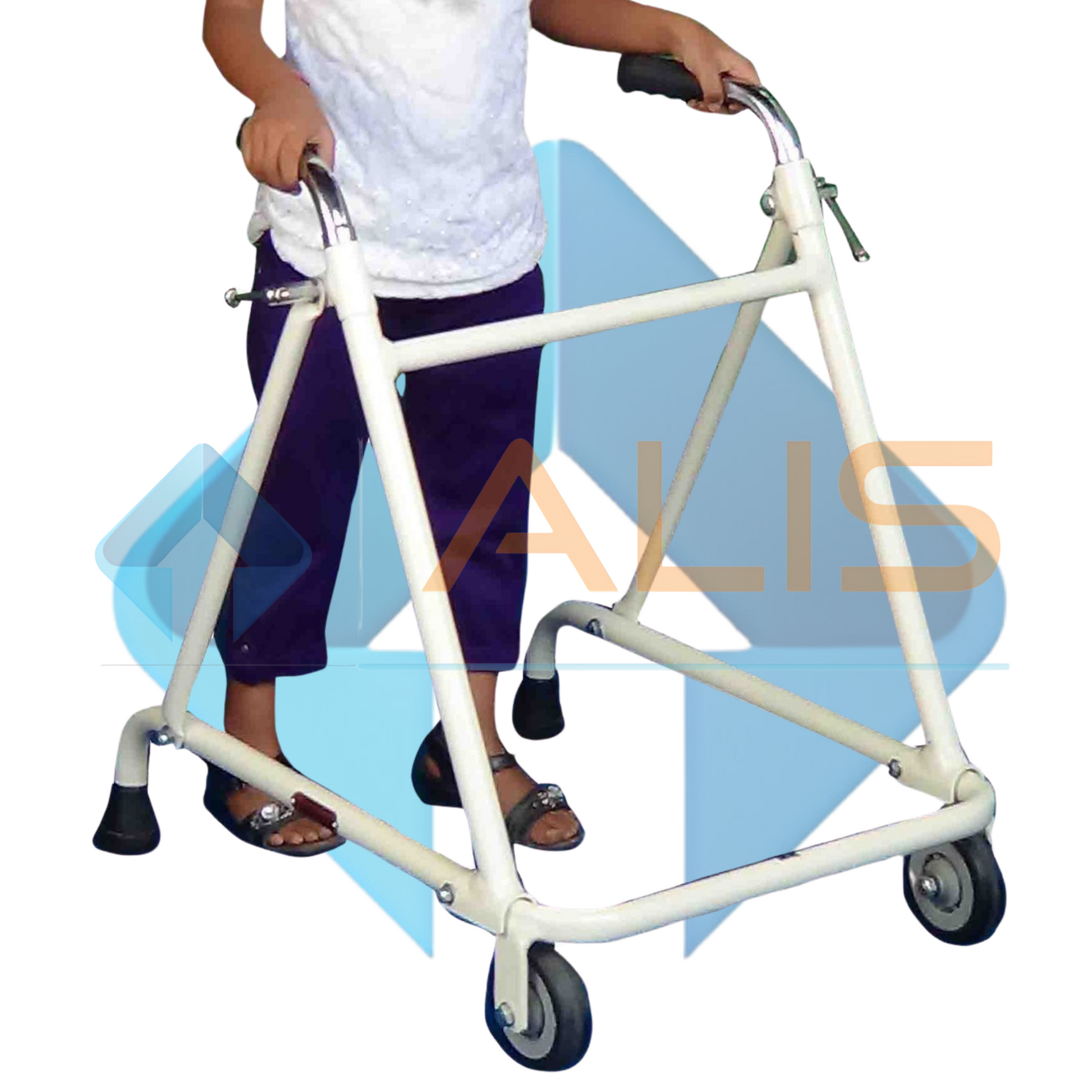 Lightweight, foldable walker. Patient pushes on handlebars while walking, while front fixed wheels prevent lateral movement. Perfect for children.