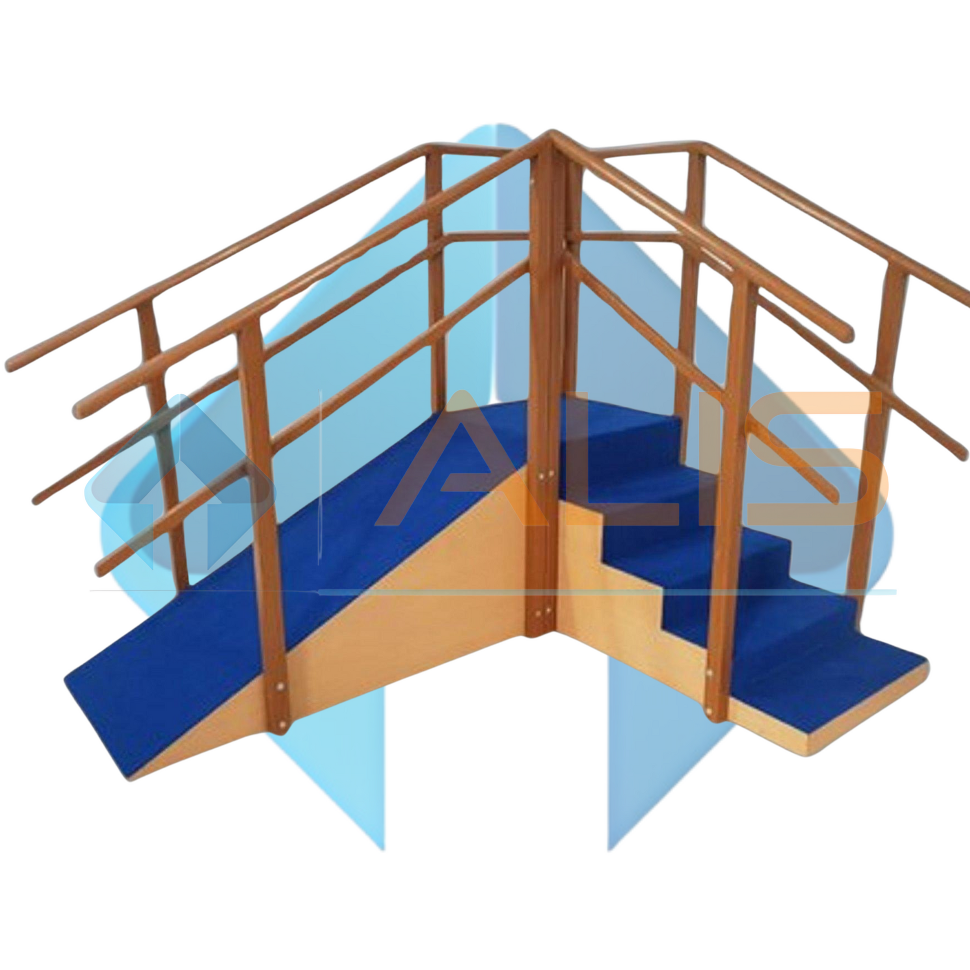 The wooden exercise corner staircase has a ramp and 5 sections with anti-slip mats and solid wood handrails to improve accessibility and therapy. Ideal for physiotherapy and exercise programs.
