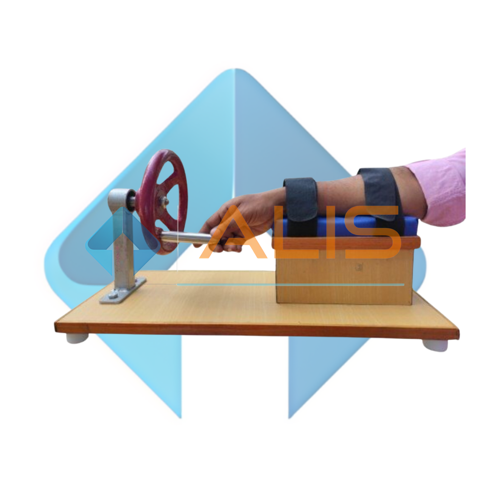 A 30cm diameter cast iron wheel and drum stand are mounted on a laminated wooden base. Size: 65cm x 22cm. Handle: A small adjustable handle is attached to the wheel for wrist circulation. Resistance: The drum has a button to adjust the resistance from zero to maximum. Armrest: A hollowed out foam padded platform, size: 22cm x 13cm x 15cm high, equipped with two straps to hold the arms, rests on the base in front of the wheel for circulation. Finish: Metal parts are powder coated